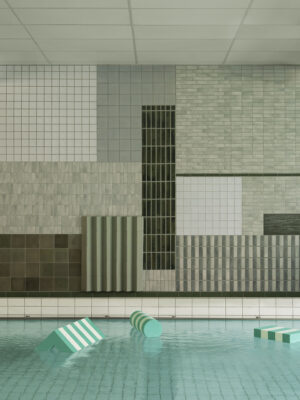 The Stockholm-based design studio Folkform has completed a permanent installation for the public indoor swimming pool in Spånga, outside of Stockholm. The mural, that runs along the short end of the pool, features a decorative composition crafted from ceramic tiles and old vintage glass. The wall comprises over 1000 individual glass and ceramic pieces and the design is inspired by the town plan of Spånga as seen from above. {–––}